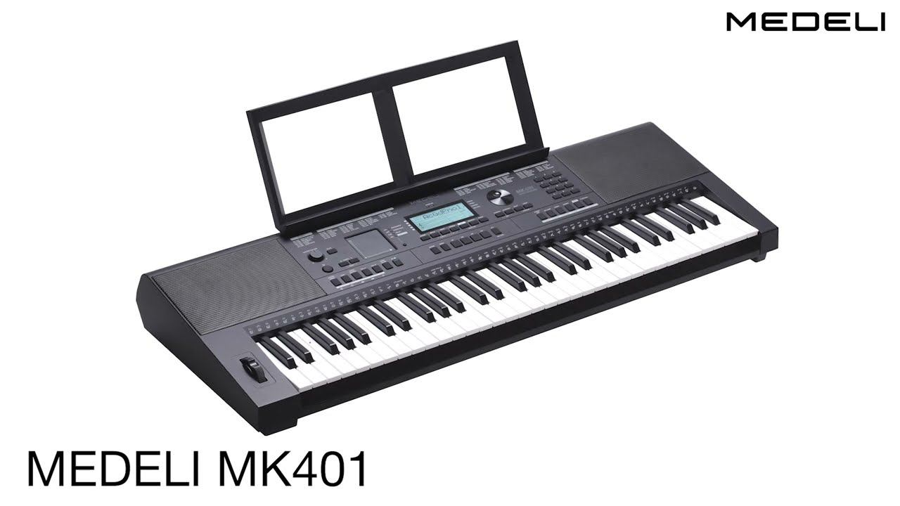 Medeli MK401 представляет собой качественный синтезатор, оснащенный сэмплером, стилями DJ и пэдом XY. Инструмент имеет обширную библиотеку встроенных стилей. Характеристики: Клавиатура: 61 клавиша с сенсорным откликом Дисплей: ЖК-дисплей с подсветкой Полифония: 64 Голоса: 600 + 5 Стили: 200 Песни: 200 пресетов, музыкальная обучающая система Разъемы: педаль сустейна (разъем 6,3 мм), слот для SD-карты Цвет: черный Усилитель: 2 x 15 Вт Динамики: 2 x 12 см Размеры: 956 x 360 x 118 мм Источник питания: DC 12 В /1000 мА, 6 батарей типа АА В комплекте: пюпитр, сетевой адаптер Вес: 5,6 кг XY-pad позволяет простым касанием резко изменить звук. Модель оснащена микрофоном, расположенным над дисплеем.