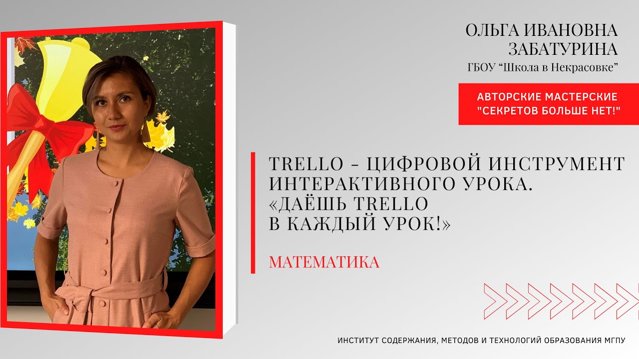 Ведущая мастерской: Забатурина Ольга Ивановна, учитель математики ГБОУ “Школа в Некрасовке” Тема: Trello - цифровой инструмент интерактивного урока. «Даёшь Trello в каждый урок!»
