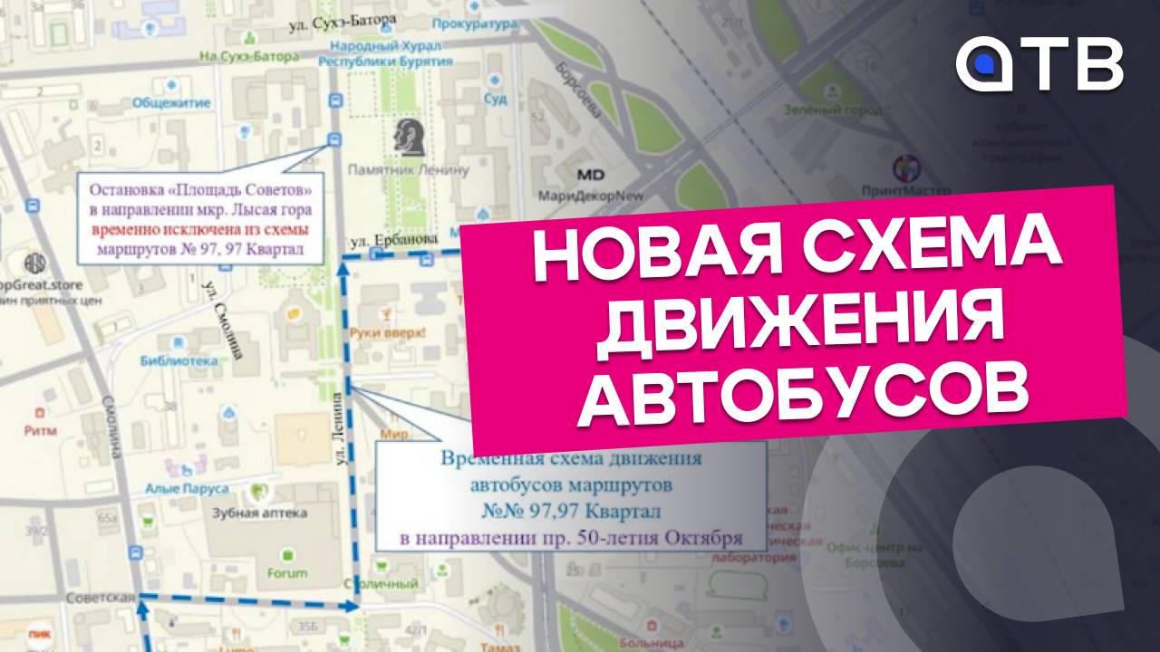 В Улан-Удэ временно изменится движение двух автобусных маршрутов. Речь идёт о 97 и 97 (Квартал). Из схемы исключили остановку «площадь Советов» на ул. Ленина. Новый маршрут вы видите на экране. Теперь автобусы при движении в сторону пр. 50-летия Октября будут следовать по маршруту улицы Советская, Ленина, Ербанова. В обратном направлении - без изменений.