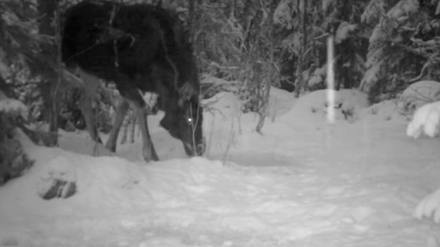 Лоси в зимнем лесу.