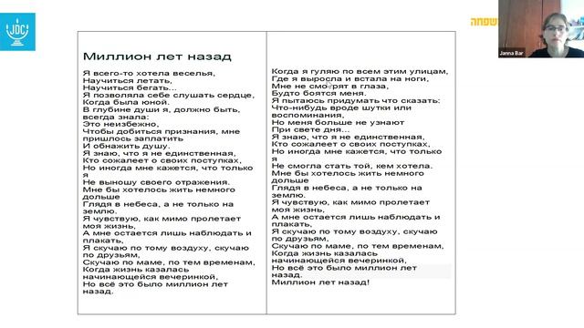 Джанна Бар, кандидат наук в области социальной работы. В своей лекции она рассказала об устройстве дневных центров и особенностях социального и эмоционального состояния пожилых людей, пользующихся их услугами.