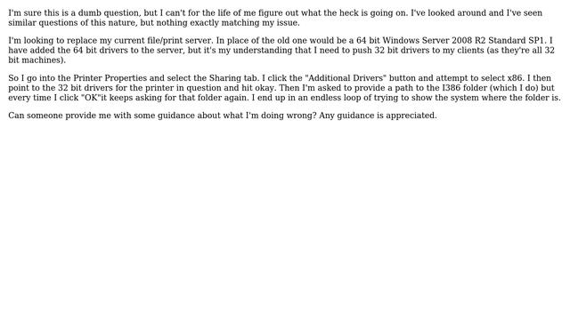 How to share print drivers from a 64 bit Windows server to 32 bit client machines? Helpful? Please support me on Patreon: https://www.patreon.com/roelvandepaar With thanks & praise to God, and with thanks to the many people who have made this project possible! | Content (except music & images) licensed under CC BY-SA https://meta.stackexchange.com/help/licensing | Music: https://www.bensound.com/licensing | Images: https://stocksnap.io/license & others | With thanks to user Nixphoe (serverfault.com/users/27920), user DKNUCKLES (serverfault.com/users/50197), and the Stack Exchange Network (serverfault.com/questions/300118). Trademarks are property of their respective owners. Disclaimer: All information is provided "AS IS" without warranty of any kind. You are responsible for your own actions. Please contact me if anything is amiss at Roel D.OT VandePaar A.T gmail.com