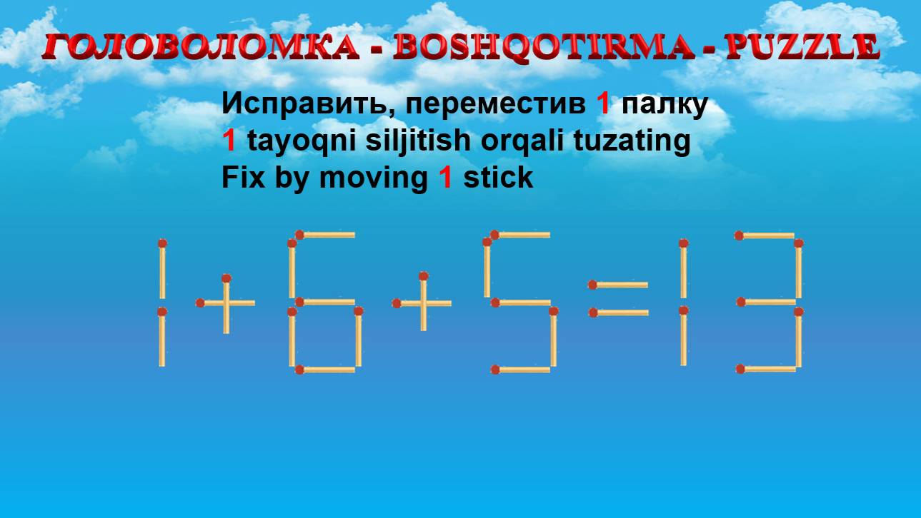 ГОЛОВОЛОМКА - BOSHQOTIRMA – PUZZLE. Спичка. 1+6+5=13, 3+2+5=12, 9+3-2=12, 5+3-6=0