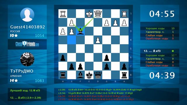 Данное видео было создано мобильным приложением ChessFriends.com **** Понравилось видео? Вы тоже можете создавать такие видео! Просто установите наше приложение, играйте и экспортируйте игры прямо в YouTube. Android: https://play.google.com/store/apps/details?id=chessfriends.online.chess iOS: https://itunes.apple.com/app/chess-online-+/id903978215?mt=8 Windows 8/10: http://apps.microsoft.com/windows/app/ajedrez-online/362ae1c9-5d6f-4824-a9e7-1095b2a95e10 OSX: https://itunes.apple.com/app/chess-online-+/id919607238?l=en&mt=12 Мобильный сайт: http://www.chessfriends.com/mobile?lang=ru_RU Facebook App: https://apps.facebook.com/chessfriendscom Windows Phone: http://apps.microsoft.com/windows/app/ajedrez-online/362ae1c9-5d6f-4824-a9e7-1095b2a95e10 **** Chess Age: Android: https://play.google.com/store/apps/details?id=chess.friends.game.play IOS: https://itunes.apple.com/us/app/chess-age/id1217007613?mt=8 Facebook: https://apps.facebook.com/chessage **** Подпишитесь на ChessFriends.com в YouTube: https://www.youtube.com/subscription_center?add_user=ChessFriendsDotCom Facebook: https://www.facebook.com/ChessFriendscom-127961610576613/?fref=ts **** Игра в формате PGN: [Event "free game"] [Site "www.chessfriends.com"] [Date "2023/1/22"] [Round "none"] [White "Guest41403892"] [Black "ТэТРэДМО"] [Result "0-1"] [ECO "D01"] [Opening "Richter-Veresov Opening; D01"] [WhiteElo "1054"] [BlackElo "1083"] [WhiteCountry "RU"] [BlackCountry "AM"] [TimeControl "420000"] 1. d4 d5 2. Nc3 Nf6 3. Bg5 h6 4. Bxf6 exf6 5. e4 dxe4 6. Nxe4 Nc6 7. Nf3 f5 8. Ng3 f4 9. Bb5 fxg3 10. Bxc6+ bxc6 11. fxg3 Bg4 12. h3 Bxf3 13. gxf3 Qd5 14. O-O O-O-O 15. f4 Qxd4+ 16. Rf2 Bc5 17. Qg4+ Rd7 18. Qxg7 Qxf2+ 19. Kh1 Rf8 20. Qxf8+ Bxf8 21. Rf1 Qxf1+ 22. Kh2 Rd2# 0-1