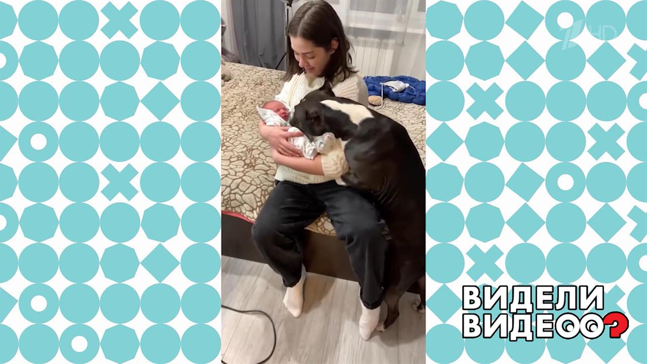 Питбуль Зиг и стаффордширский терьер Бона очень трогательно общаются с младенцем.