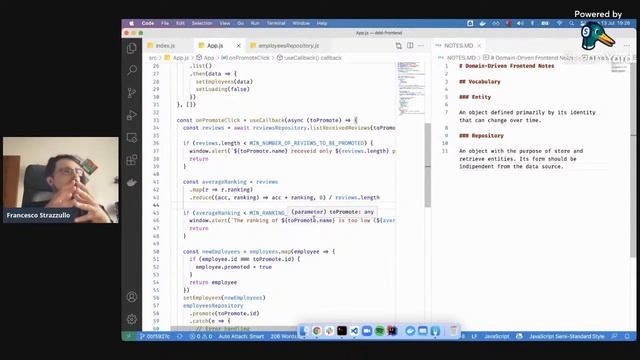 Meetup #16 Ticino Software Craft https://www.meetup.com/it-IT/ticino-software-craft/ ? Abstract DDD is probably one of the most important ecosystems of the last 15 years of software engineering. Nowadays frontend applications are an important piece of software architecture. Nevertheless, Value Object, Aggregates, Repositories, Anticorruption Layers are all well-known concepts that somehow are often not applied when building large and complex frontend applications. The purpose of this talk is to show how some of the DDD techniques are easily applied to Frontend engineering, resulting in more robust and evolvable codebases. ? Speaker: "I’m a Developer and Partner @ flowing. I’m also a speaker at tech conferences and meetup. I’m the author of “Frameworkless Front-end Development” and “Decision-making for Software Development Teams”. In my free time, I like to relax playing with my Playstation or cooking some strange ethnic dish for my wife. https://www.francescostrazzullo.info