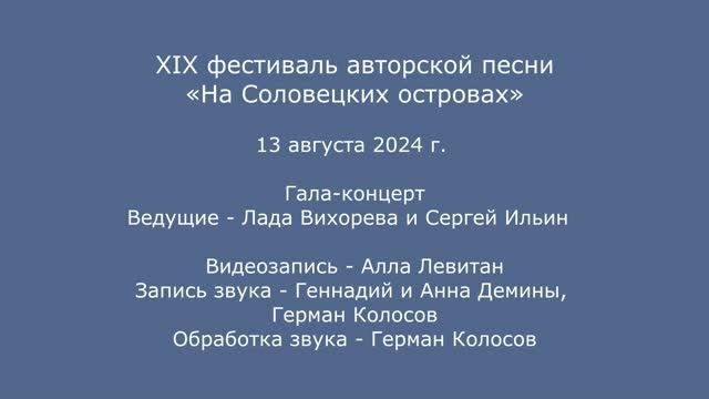 XIX фестиваль авторской песни «На Соловецких островах». 13 августа 2024 г. Гала-концерт. Ведущие - Лада Вихорева и Сергей Ильин. Видеозапись - Алла Левитан. Запись звука - Геннадий и Анна Демины, Герман Колосов. Обработка звука - Герман Колосов.