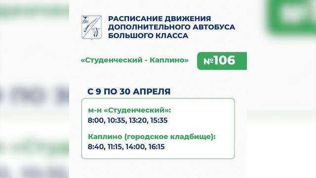 Маршрут №106 “Студенческий - Каплино” будет отправляться 12 раз в день. К основному расписанию добавили еще 4 рейса: в 8:00, 10:35, 13:20 и 15:35. Обратно - в 8:40, 11:15, 14:00, 16:15. Из северо-восточной части Оскола автобус к месту захоронений по-прежнему отправляется 5 раз в день. Номер маршрута - 106А.