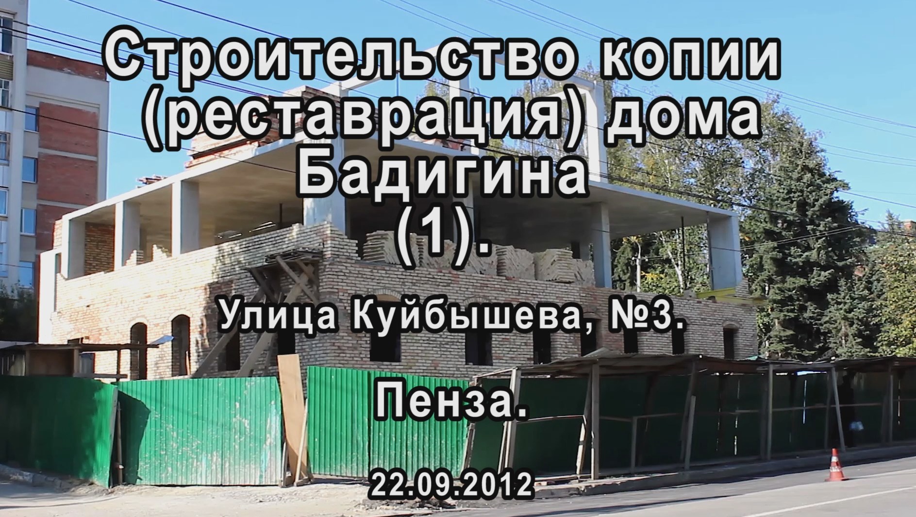#Пенза #ПензенскаяОбласть #УлицаКуйбышева #СурскийКрай Строительство копии исторического здания - усадьбы XIX века, в которой в 1910 году родился исследователь Арктики, капитан дальнего плавания, кандидат географических наук, писатель, герой Советского Союза Константин Бадигин. Здание - усадьба, которая находилась на этом месте, была включена в региональный реестр памятников истории. После пожара была полностью демонтирована. Автор видео: Альберт Полковников Яндекс.Дзен - https://zen.yandex.ru/media/id/5b3a0a8abbe87d00a89b2583/penza-restavraciia-doma-badigina-1-22092012-618ccfb52d9e1f592a5a793d?from=channel&rid=2095208867.244.1636618937259.36901 Rutube.ru - https://rutube.ru/video/56115e650ccf0923232857ba45e37e1d/ YouTube - https://youtu.be/dshKBwxQaf0 ОК - https://ok.ru/video/3323973733108 ВК - https://vk.com/video13049397_456239385