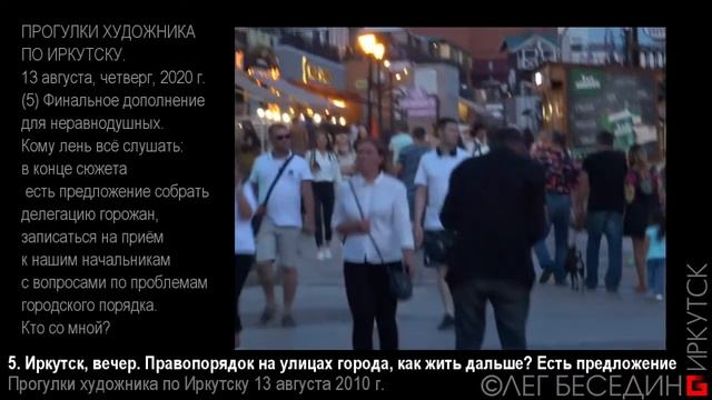 ПРОГУЛКИ ХУДОЖНИКА ПО ИРКУТСКУ. 13 августа, четверг, 2020 г. (1) начинаем, как обычно с Центрального рынка. - Маяки рыночных дизайнеров - Наши цены. Иногородние, - сравните?! - Игры коммерсов. Зачем загоняли под крышу старушек с морковкой? Кто выиграл? А мы проиграли. https://www.facebook.com/oleg.besedin/posts/3242671742459488 (2) Трудно обойти этот шедевр реставрации и сохранения истории Иркутской архитектуры (так подаётся СтотридцатоМодный квартал). Пробежим его быстро-быстро! По пути собирая фото для предстоящей публикации о наших рекламных вывесках. Кому это надоело или безразлично, листайте на третью часть, где вас ждёт Петрович со своими приколами. https://www.facebook.com/oleg.besedin/posts/3242780869115242 (3) Позитивная часть, обещанный Петрович - Олег Ермолович, иркутский носитель и распростанитель вируса жизнелюбия, юмора и неувядающей юности! ?? И немного от меня пленэрных картинок заканчивающегося лета. https://www.facebook.com/oleg.besedin/posts/3242827292443933 (4) Финальное дополнение для неравнодушных. Кому лень всё слушать: в конце (~14 мин) есть предложение собрать делегацию горожан, записаться на приём к нашим начальникам с вопросами по проблемам городского порядка. Кто со мной? https://www.facebook.com/oleg.besedin/videos/3242901162436546
