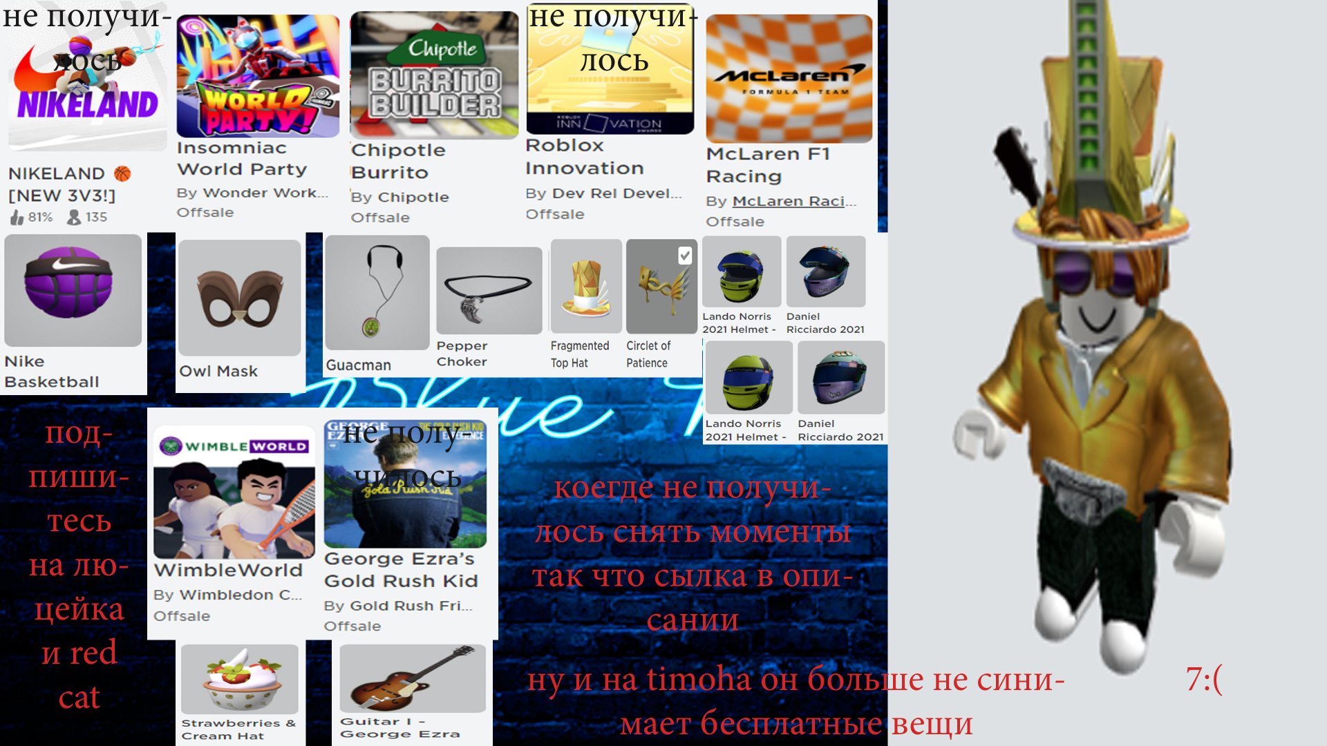Под видио rainbow friends поставили 5 лайков и я как обещал сделал видео про бесплатные вещм :0) люцейка https://www.youtube.com/watch?v=46RkzsKLzP0&list=PLs1djQzBv69Nuf_AnGEfuq1BTGHpcMDfC&index=3&t=1 timoha https://www.youtube.com/watch?v=PFr3yI-jyRU&list=PLs1djQzBv69Nuf_AnGEfuq1BTGHpcMDfC&index=2&t=242s и https://www.youtube.com/watch?v=HV5KSVT7CEo&list=PLs1djQzBv69Nuf_AnGEfuq1BTGHpcMDfC&index=1 red cat https://www.youtube.com/watch?v=sUBsprcatVw
