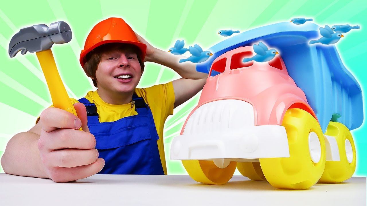 Автомастерская Саши: на грузовик упал сверху строительный кубик! Крутые видео про машинки