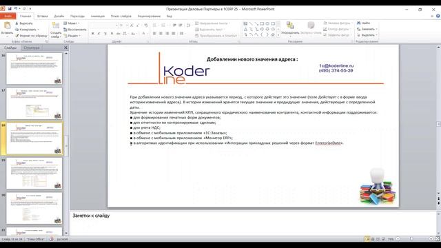 Компания «Кодерлайн» провела вебинар «Деловые Партнеры в 1С:ERP 2.5» Ведущая: Ненашева Мария Андреевна - эксперт в области ЭЦП и ЭДО Целевая аудитория Вебинар будет полезен сотрудникам, ответственным за внедрение и сопровождение системы на предприятии, пользователям системы. Описание Система 1C:ERP 2.5 включает широкие возможности по ведению данных по Деловым Партнерам, позволяет отражать Компании, включающие несколько юридических лиц, сеть магазинов или несколько обособленных подразделений. В ходе вебинара будут рассмотрены принципы регистрации нового делового партнера, введения информации о партнерах со сложной структурой. Программа 1. Обзор возможностей системы 1C:ERP 2.5. 2. Деловые партнеры 2.1. Регистрация нового делового партнера 2.2. Ввод информации о компании, которая состоит из нескольких юридических лиц 2.3. Ввод информации о сети магазинов (множество партнеров, одно юридическое лицо) 2.4. Регистрация контактных лиц партнеров 2.5. Поддержка хранения истории изменений реквизитов контрагента 2.6. Получение сводной информации по партнеру 3. Автоматическое заполнение реквизитов контрагентов 4. Проверка контрагентов ФНС 5. Обособленные подразделения контрагентов