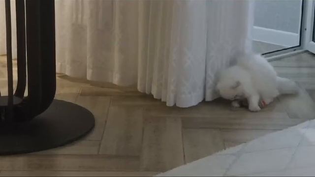 Котик Винни Пух играет с игрушкой и кувыркается