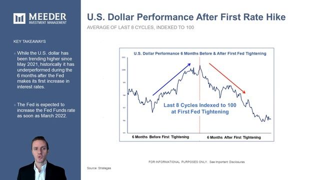 Markets in Focus from Meeder Investment Management for January 21, 2022 highlights key trends including interest rates moving higher, U.S. small-cap stocks breaking down, and U.S. dollar performance during rate hikes. Gain 3 insights in 5 minutes from Meeder Investment Management—every other week. Investors and financial advisors get informed on the latest market trends from investment portfolio manager Joe Bell, CFA, CMT, CFP® of MeederInvestment.com. This is a convenient and quick way to get access to current financial information you can share with your clients. Whether you’re looking at financial management insights around capital markets, investments, mutual funds, portfolios, retirement, public funds, cash management, wealth management, private client, financial advisor, or wealth advisor—you’ll benefit from Mr. Bell’s deep understanding and tracking of today’s important topics. See and bookmark the series on the Meeder website at: https://meederinvestment.com/MarketsInFocus The Meeder Investment Management team is ready to answer your questions and help you prepare for the future. We're here for you. Learn more at MeederInvestment.com. Years of navigating various market cycles have influenced Meeder’s holistic approach to managing money. Meeder’s investment philosophy encourages a multidimensional view, as the company believes there are multiple forces that influence the market, and many ways to achieve investment objectives. This wide view of the markets, and Meeder’s quantitative process, allows the firm to customize solutions and services for a variety of clients. Meeder Investment Management is dedicated to helping financial advisors and their clients reach their goals. Using a model-driven, multi-discipline/multi-factor approach to investing, the objective is to improve outcomes for investors with varying goals. Meeder offers a full spectrum of mutual funds, including asset allocation, global/international, equity, and fixed income funds. Asset allocation portfolios are constructed using proprietary mutual funds and combine Equity, Defensive Equity and Fixed Income strategies, which are designed to complement one another to achieve client objectives. Meeder Investment Management has been helping clients successfully reach their financial goals since the firm’s inception in 1974. Located in Dublin, Ohio, Meeder has over 100 professionals dedicated to serving the financial needs of individuals, corporations, and government entities, with over $25 billion in assets under management, advisement, and administration. Meeder Investment Management operates as the parent entity to affiliated registered investment advisers Meeder Asset Management, Inc., Meeder Advisory Services, Inc., and Meeder Public Funds, Inc. Meeder Funds are distributed by Meeder Distribution Services, Inc., a broker-dealer affiliate of Meeder Investment Management. Meeder Asset Management, Inc., serves as the investment adviser to Meeder Funds and affiliated entity Mutual Fund Services Company serve as the administrator, accountant, and transfer agent for the Meeder Funds. Joe Bell’s highly detailed reporting comes from his 16 years of experience in the investment industry. He currently manages a group of Equity mutual funds and portfolios focusing on capital appreciation, tactical allocation, multi-factor systematic investing, and risk management. Funds and SMAs managed include Long-Short, Large-Cap Blend, Mid-Cap Value and Dividend/Growth. Mr. Bell utilizes fundamental, technical, economic, and sentiment factors to evaluate the market, sectors, and individual stocks and he has extensive experience with equity and option portfolios. Mr. Bell has vast experience providing research, content, and analysis for investors, institutions, and media outlets, and has appeared 100+ times on live television and radio programs and shows. He has been a frequent guest on CNBC, Fox Business TV, and CNBC Asia. IMPORTANT DISCLOSURES: Commentary offered for informational and educational purposes only. Statements attributed to an individual represent the opinions of that individual as of the date given and do not necessarily reflect the opinion of the firm. Opinions and forecasts regarding markets, securities, products, portfolios or holdings should not be construed as predictions or recommendations. All information is given as of the date shown and is subject to change at any time. Nothing herein should be construed as an offer to sell, solicitation, or recommendation of any security or investment product. Certain information and data has been supplied by unaffiliated third parties as indicated. Although Meeder believes the information is reliable, it cannot warrant the accuracy, timeliness or suitability of the information or materials offered by third parties.