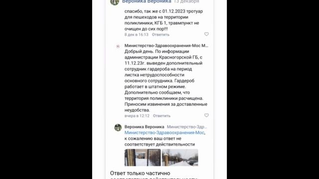 Ответ только частично соответствует действительности - появился сотрудник в гардеробе и то вещи принимают только до 15 часов, а в 16 гардероб закрывается и начинается самообслуживание. Напоминаю, что врачи официально ведут прием до 20 часов и до этого времени вам выдают талоны на запись. Тротуар для пешеходов - только сейчас пришел ответ с сайта Добродел, что к поликлинике и то только к центральному входу очистили тротуар для пешеходов от снега, на территории женской консультации ответа нет - а там аналогично снег. Аналогично и по территории самой больницы и поликлиники - первый ответ не соответствовал действительности. По этой причине, если вы идете на прием во второй половине дня - одежду есть смысл брать с собой - помните, что в этом случае администрация поликлиники не несёт ответственность за ваши вещи - когда в гардеробе нет сотрудников! Желаю вам здоровья. #2023 #россия #красногорск #город #дом #ответ #отчет #информация