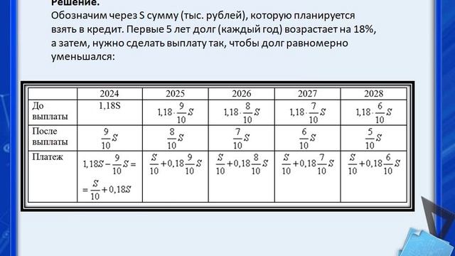 В июле 2023 года планируется взять кредит на 10 лет на некоторую сумму. Условия возврата таковы: - каждый январь с 2024 по 2028 год долг возрастает на 18 % по сравнению с концом предыдущего года; - каждый январь с 2029 по 2033 год долг возрастает на 16 % по сравнению с концом предыдущего года; - с февраля по июнь необходимо выплатить часть долга; - в июле каждого года долг должен быть на одну и ту же сумму меньше долга на июль предыдущего года; - к июлю 2033 года кредит должен быть полностью погашен. Найдите сумму, которую планируется взять в кредит, если общая сумма выплат по кредиту должна составить 1470 тыс. рублей.