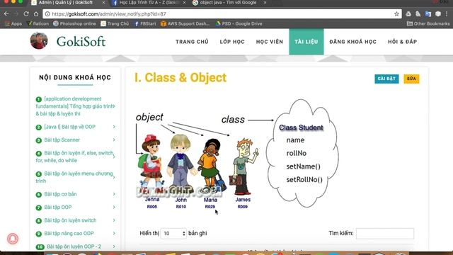 Nội dung: Khóa học lập trình Java căn bản Website học: http://gokisoft.com Java là ngôn ngữ lập trình máy tính có tính chất hướng đối tượng, dựa trên các lớp, thường được sử dụng cho các hệ thống có tính độc lập cao. Nó được sử dụng để hướng tới các lập trình viên viết ứng dụng "write one, run everywhere" Nội dung khóa học: 1. Hướng dẫn cài đặt môi trường lập trình Java http://bit.ly/2z6COrN 2. Hướng dẫn tạo dự án Java đầu tiên http://bit.ly/2HdaWqw 3. Khai báo biên & toán tử trong Java http://bit.ly/2NedsRe 4. Tìm hiểu về if, else, witch trong lập trình Java http://bit.ly/2ZczkyP 5. Tìm hiểu Loop (for, while, do while) http://bit.ly/2KECIOG 6. Tìm hiểu về Class và Object trong lập trình Java http://bit.ly/33GCle1 7. Tìm hiểu về mảng (array) và List, ArrayList trong Java http://bit.ly/2TKcHQV 8. Hướng dẫn phát hành dự án java http://bit.ly/2P4hApv 9. Kế thừa OOP - Lập trình java http://bit.ly/2Nc7uQC 10. Interface - OOP lập trình java http://bit.ly/2MnwiFZ Thực Hành: 1. Chữa bài tập quản lý sinh viên - lập trình hướng đối tượng java http://bit.ly/2Z0YqVO 2. Hướng dẫn chữa bài tập quản lý sách http://bit.ly/30hRfoO 3. Bài tập ôn luyện lập trình OOP & Interface http://bit.ly/2KWqIqI 4. Chũa bài tập Employee & StudentMark & Product trong lập trình OOP http://bit.ly/30irMeY 5. chu vi + dien tich hinh tron va hinh chu nhat http://bit.ly/30g5v1y 6. chương trình quản lý thuế và giá oto http://bit.ly/2KR9NG4 7. tao chuong trinh TIVI bang java http://bit.ly/2Zczzdd 8. bài tập quản lý xe cộ + quản lý bãi đỗ xe http://bit.ly/2KHjDvy 9. BT519 Chua bai tap ke thua hinh tron + hinh chu nhat http://bit.ly/33IrOza
