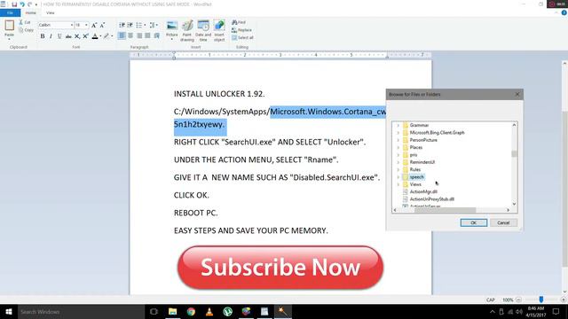 TODAY TOPIC:- HOW TO PERMANENTLY DISABLE CORTANA WITHOUT USING SAFE MODE INSTALL UNLOCKER 1.92 C:/Windows/SystemApps/Microsoft.Windows.Cortana_cw5n1h2txyewy RIGHT CLICK "SearchUI.exe" AND SELECT "Unlocker" UNDER THE ACTION MENU, SELECT "Rename" GIVE IT A NEW NAME SUCH AS "Disabled.SearchUI.exe" CLICK OK REBOOT PC EASY STEPS AND SAVE YOUR PC MEMORY ====================================================== ⟶VIDEO EDIT SOFTWARE:Wondershare Filmora ⟶VIDEO RECORDING SOFTWARE:RADEON RELIVE Stay Connected: ⟶Subcribe Youtube page:https://goo.gl/6kBHw3 ⟶ Like Facebook page:https://www.facebook.com/Lord-Games-640091876148652/ ⟶ Follow on Twitter:https://twitter.com/farqaleetchand2 ⟶ Follow on Pinterest:https://www.pinterest.com/lordsgaming/ Thanks for watching.