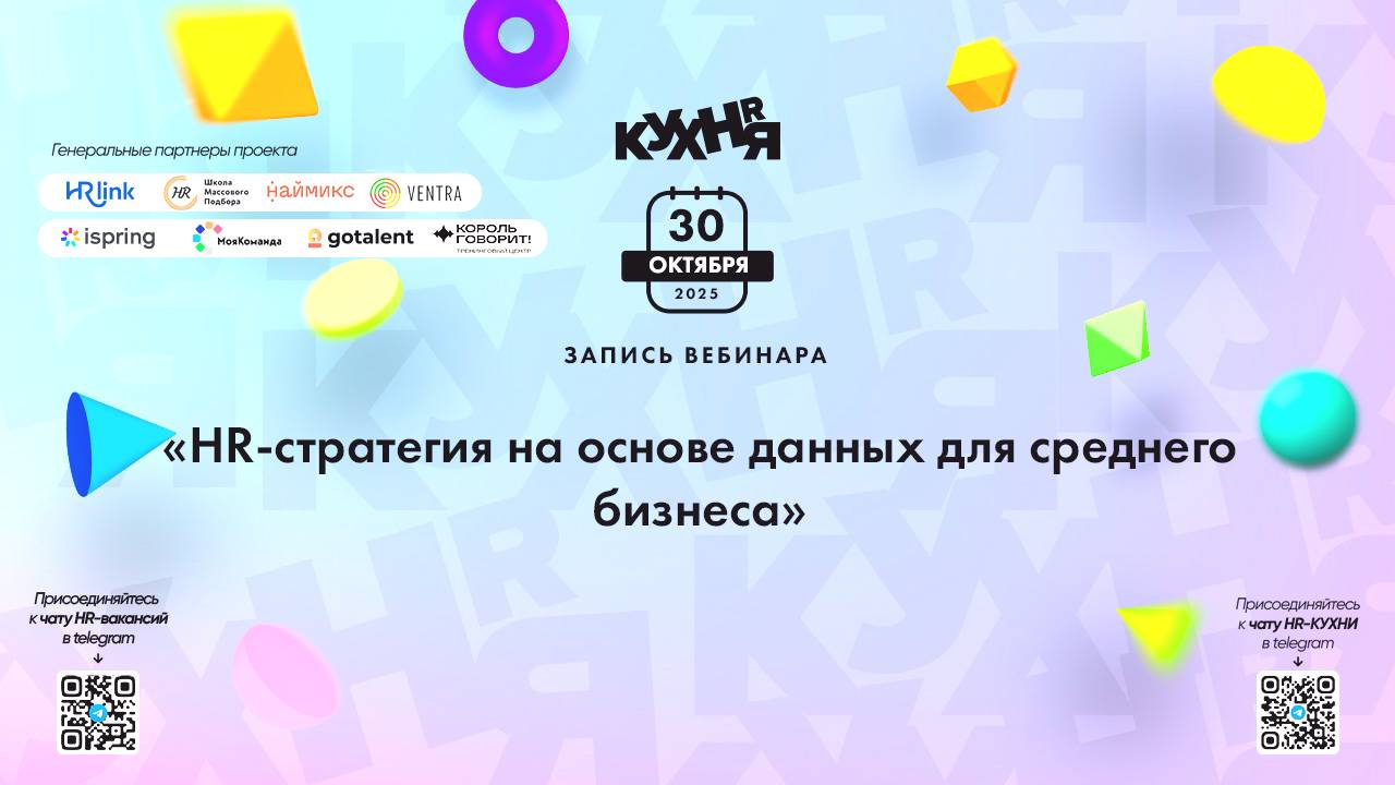 Присоединяйтесь к чатам и каналам HR-КУХНИ в телеграм: - Основной чат HR-КУХНИ в телеграм - https://t.me/+tYgAH0PgPQVkOWIy - Канал HR вакансий в телеграм - https://t.me/+CMNAN2u1hjo3M2Ri - Канал HR-EVENTS в телеграм - https://t.me/hr_kitchen - Канал HR JOURNAL в телеграм - https://t.me/hrkitchenjournal Полезные ссылки: - Каталог HR решений - https://hrkitchen.ru/exhibition - График конференций, бесплатных вебинаров, а также бесплатные курсы – https://hrkitchen.ru/ - Стать спикером HR-КУХНИ - https://hrkitchen.ru/speakers - Подписаться на полезную e-mail рассылку от HR-КУХНИ (новости, гайды, чек-листы, подарки от партнеров) - https://hrkitchen.ru/subscribe