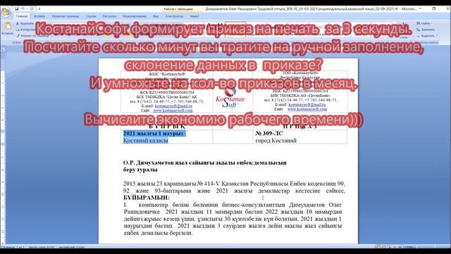 00:03 Просмотр приказа на казахском языке перед печатью. 01:35 Просмотр приказа на русском языке перед печатью. 01:56 Кнопка [История ранее напечатанных документов]. Образцы приказов из программы КостанайСофт (каждый пользователь легко может шаблоны в Word редактировать): 02:27 ЕШЕБЖ-ға еңбек шарттары туралы мәліметтерін ұсынуға жауапты тұлғаларды тағайындау туралы (О назначении лиц, ответственных за предоставление сведений о трудовых договорах в ЕСУТД). 02:36 Об изменении заработной платы. 02:40 О назначении на должность директора (Директор лауазымына тағайындау туралы). ************************************* Ссылка на таблицу сроков и правила ЕСУТД http://www.kostanaysoft.com/blog/pravila_predostavlenie_svedenij_o_trudovom_dogovore_v_esutd/2020-08-29-58 ************************************* А ТАК ЖЕ: Мы уже уверенно можем рекомендовать Вам сервис ЕСУТД: KostanaySoft и не тратить время на ручной способ внесения сведений на сайте enbek.kz. С помощью сервиса ЕСУТД: KostanaySoft, трудовые договоры, пролонгация ТД, социальные отпуска, расторжение и проактивное назначение пособий по беременности и родам автоматически отправляются из программы “Кадровый учет РК” в ЕСУТД. ⠀ Бесплатное подключение: ✔️ Просто провели приказ в программе, выбрали ЭЦП и все - данные ушли в ЕСУТД – 10 сек.. ✔️ Вашим программистам не нужно ничего настраивать, разрабатывать и дорабатывать в программе. ✔️ Вы экономите драгоценное рабочее время. ✔️ Всю информацию воедино видите в электронном личном деле: прием, все отпуска, стаж, ЕСУТД, отчетность, воинский учет, семья и образование, расторжение и мн.др. ⠀ К сервису вы подключаетесь бесплатно – узнайте больше по телефону или WhatsApp: ⠀ Whatsapp: 8 705 540 98 73 тел.: 8 (7142) 54 49 77 сайт: kostanaysoft.com ******************************************************* Канал Канал телеграмм по ссылке https://t.me/kadrovik_kz ******************************************************* Желаете оптимизировать свое рабочее время и не тратить его на ручное заполнение договоров, соглашений, заявлений, изменения склонений по падежам, заполнения периодов прописью, да еще на 2-х языках, а еще отправлять автоматически сведения о трудовых договорах в ЕСУТД, минуя ручной ввод данных на сайте enbek.kz? Внедрите казахстанскую программу "Кадровый учет" #KostanaySoft которая поможет вам автоматизировать заполнение всех кадровых документов: приказов, уведомлений, актов, дополнительных соглашений, справок, договоров обучения, трудовых договоров, соглашений и т.д.. +7 (705) 540-98-73 info@kostanaysoft.com Приятного просмотра! ******************************************************* БЕСПЛАТНО демо-версия по ссылке для Казахстана http://www.kostanaysoft.com/load/demo... Бесплатно демо-версия для России http://www.kostanaysoft.com/load/demo... #ТрудовойКодексРК #НалоговыеВычетыРК #кадровыйучетказахстан #кадровыйучет #кадровоеделопроизводство #простойприказ #ПрограммаДляКадровика #ЕңбекКодексі #КадрыКазахстана #КадровыйДокументооборот #СделановКазахстане #ТрудовойКодексРК ******************************************************* Описание модулей ПО "Кадровый учет" для организаций всех форм собственности РК см. по ссылке http://www.kostanaysoft.com/index/kad... Авторское право на ПО "Кадровый учет" зарегистрировано в комитете интеллектуальной собственности см. по ссылке http://www.kostanaysoft.com/index/avt... ******************************************************* Форум по работе с программой "Кадровый учет" http://www.kostanaysoft.com/forum/2 Одноклассники https://ok.ru/kostanaysoft Вконтакте https://vk.com/kadry_uchet Фэйсбук https://www.facebook.com/kadrovik.kz/ Инстаграм @kadrovik_kz @kostanaysoft https://www.instagram.com/kadrovik_kz/ Телеграмм https://t.me/kostanaysoftBot ************************************************