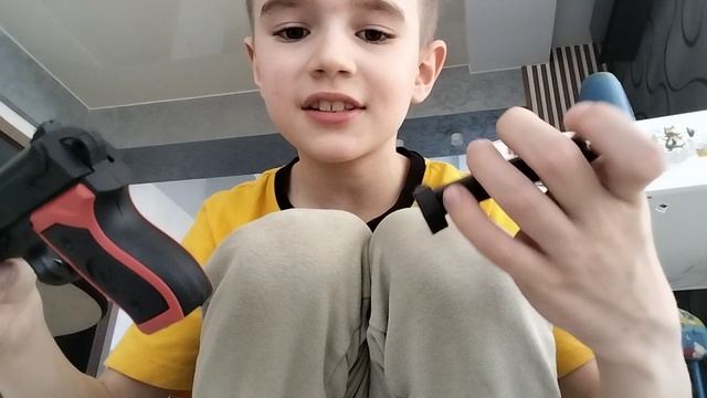 Показываю игрушечную модель пистолета.
