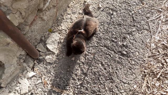 Котёнок Мишка вышел на прогулку, озирается и всё домой норовит сбежать, на голубей не реагирует.