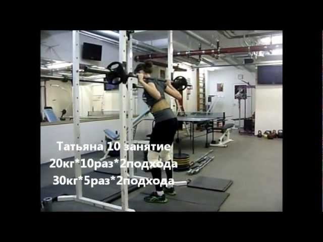 Татьяна (48кг), 10 занятие. Приседания: 20кг*10раз*2подхода; 30кг*5раз*2подхода; 40кг*3раза*2подхода; 50кг*1*2похода; 55кг*1*4подхода. Спортстудия персонального тренинга. http://sportstudio.ru