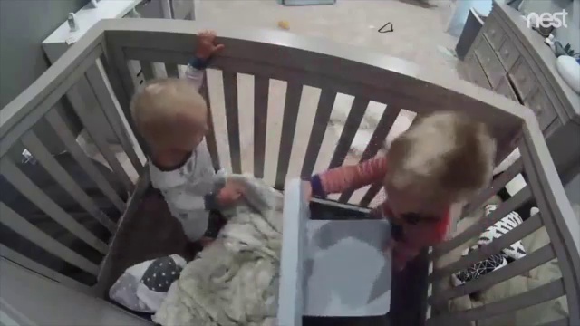 Старший брат помог младшему вылезти из детской кроватки.