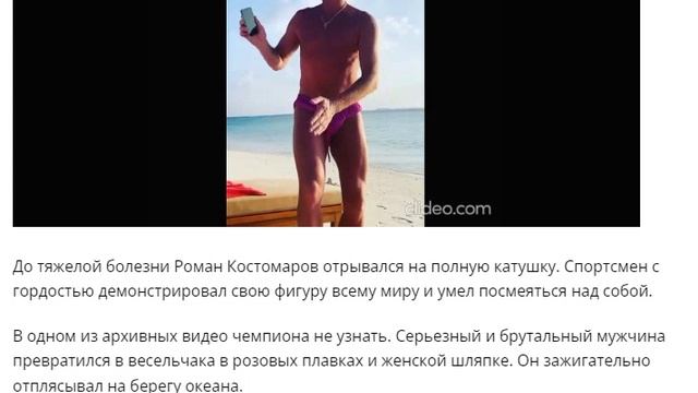 VESUG поддержать меня можно здесь-https://www.donationalerts.com/r/we5fexwyagat До тяжелой болезни Роман Костомаров отрывался на полную катушку. Спортсмен с гордостью демонстрировал свою фигуру всему миру и умел посмеяться над собой. В одном из архивных видео чемпиона не узнать. Серьезный и брутальный мужчина превратился в весельчака в розовых плавках и женской шляпке. Он зажигательно отплясывал на берегу океана. В глаза бросается прекрасная фигура мужа Оксаны Домниной. Взор привлекают мускулистые руки и ноги, кубики на животе и накаченные ягодицы звезды. «Шляпа мамы, а папа танцует!!!» — говорил Роман. У Романа, судя по ролику, было прекрасное настроение. Он танцевал на камеру в розовых плавках, надев при этом панаму жены. Многие тогда решили, что этот ролик слегка странный. Сейчас же поклонники Костомарова с ностальгией пересматривают видео, на котором фигурист еще здоровый и не подозревает, в какой беде окажется всего через год.