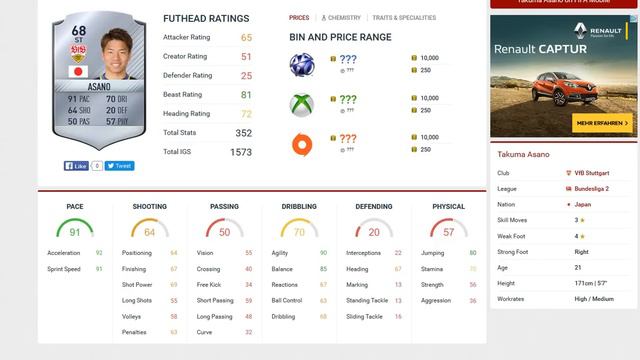 TAKUMA ASANO VFB STUTTGART 2 BUNDESLIGA FIFA 17 STATS