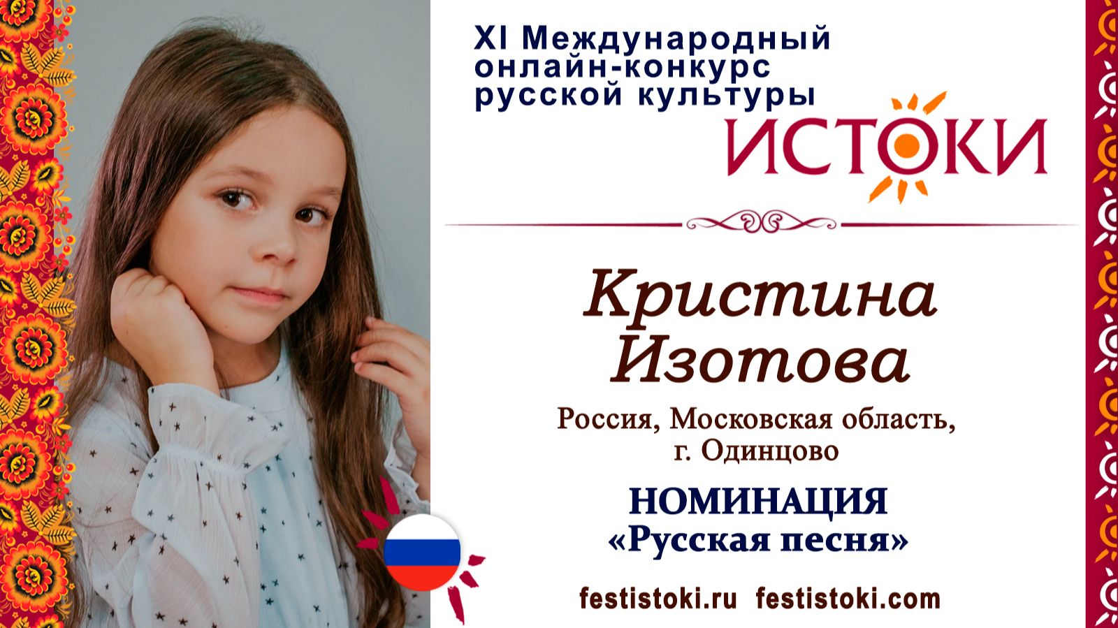 Участник ХI Международного онлайн-конкурса русской культуры "Истоки". Номинация "Русская песня". Песня "В деревне ёжики". Музыка: В. Березинский, Слова: Ю. Гуреев. Сайт: festistoki.ru / festistoki.com E-mail: festistoki@mail.ru