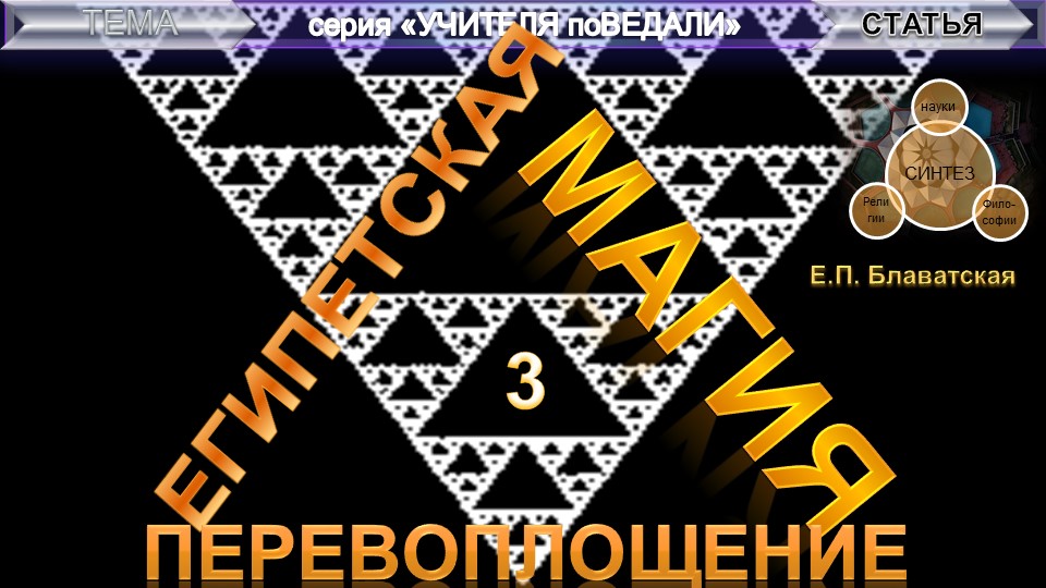 Статья Е.П. Блаватской "ЕГИПЕТСКАЯ МАГИЯ - Перевоплощение, транмиграция, одержание в Египте (ч 2) - статья Е.П. Блаватская (1831-1891 гг) из серии "Учителя поВедали", в которую входят аудио-видео тома, составленные и (или) скомпонованные Небесной Нитью (НН) на разные заданные темы из Записей воплощенных Учителей Земли. "Синтез науки, религии и философии" - так обозначила суть своих трудов сама Елена Петровна Блаватская (1831-1891 г.г.) - великая наша соотечественница (урожденная Ган в г. Екатеринослав Российской империи, позднее переименованный г. Днепропетровск УССР, ныне в г. Днепр Украина), - стоявшая у истоков экстраординарного мировоззрения, основательница Теософского Общества (1875 Нью-Йорк).