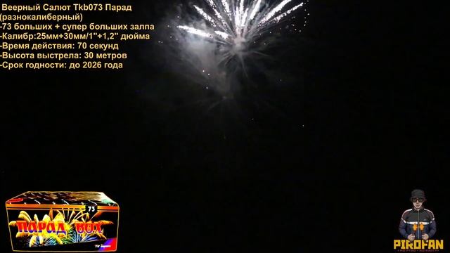 https://vk.com/PiroFan - СУПЕРЦЕНА в нашем официальном магазине TKB073 Салют 73 больших+супербольших залпа, фейерверк Парад (веерный) - Калибр: 25мм+30мм = 1"+1,25" дюйма - Время действия: 70 секунд - Высота выстрела: 30 метров - Есть сертификат и гарантия от ПироФан