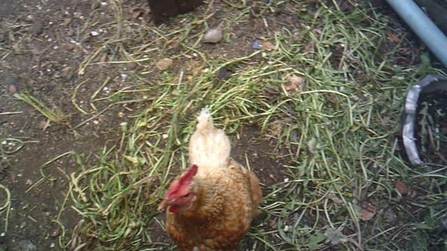 Кормление курочки одуванчиками, выполонными в огороде.