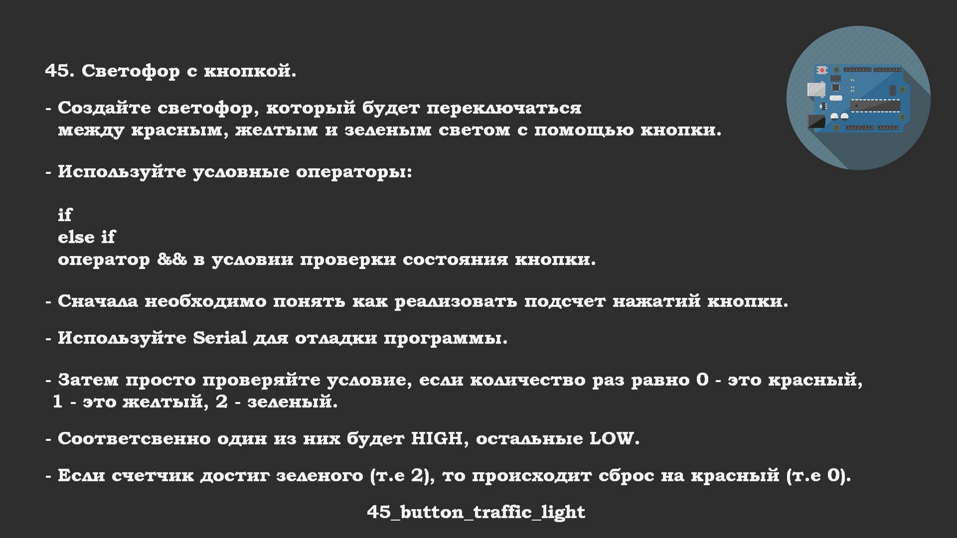 Rutube ответ: https://rutube.ru/video/e2d2c56722055506e762f11c0472bc3c/ 45. Светофор с кнопкой. Создайте светофор, который будет переключаться между красным, желтым и зеленым светом с помощью кнопки. Используйте условные операторы: if else if и оператор && в условии проверки состояния кнопки. if (условие1) { // выполняется, если условие1 истинно } else if (условие2) { // выполняется, если условие1 ложно, а условие2 истинно } else { // выполняется, если ни одно из условий не истинно } Сначала необходимо понять как реализовать подсчет нажатий кнопки. Используйте Serial для отладки программы. Затем просто проверяйте условие, если количество раз равно 0 - это красный, 1 - это желтый, 2 - зеленый. Соответсвенно один из них будет HIGH, остальные LOW. Если счетчик достиг зеленого (т.е 2), то происходит сброс на красный (т.е 0). 45_button_traffic_light Весь код "Arduino Starter Kit задачи для начинающих (Набор Ардуино)" с задачами и ответами: https://gitflic.ru/project/lashko_ag/arduino-starter-kit-zadachi-dlya-nachinaushchih-nabor-arduino Telegram-канал Arduino робототехника: https://t.me/arduino_robotics_channel Rutube плейлист Arduino Starter Kit: задачи для начинающих (Набор Ардуино): https://rutube.ru/plst/1196693/ Rutube плейлист: ответы на задачи: https://rutube.ru/plst/1196692/ #Arduino #StarterKit #НаборАрдуино #ОбучениеArduino #Программирование #ОбучениеПрограммированию #КурсыArduino #ПрограммированиеДляНачинающих #lashko #АлексейЛашко