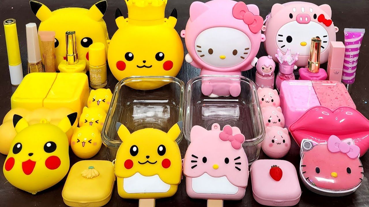 Слайм Пикачу против Китти, смешивающий макияж и блестки в Слайм, увлекательные Слаймыа Видео ASMR