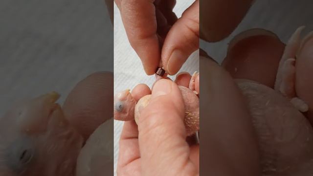 Кольцевание птенца волнистого попугая .