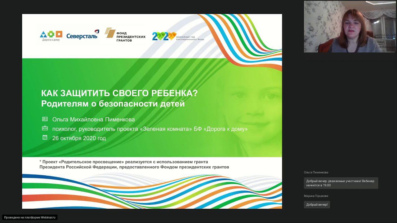 В современном мире опасности подстерегают ребенка со всех сторон и мы, взрослые, порой даже не догадываемся о том, что ребенок попал в беду. Как родителям обезопасить своего ребенка рассказала психолог, руководитель проекта "Зелёная комната" благотворительного фонда "Дорога к дому" Ольга Пименкова. Вопросы, которые рассмотрены: - обзор проблем и статистических данных по возникновению опасных ситуаций в жизни детей - рекомендации родителям по созданию безопасной атмосферы для развития ребенка дома, на улице и в интернете - рекомендации родителям по проведению профилактических бесед со своими детьми по формированию навыков безопасного поведения - что делать, если ребенок пропал? - что делать, если рядом бьют ребенка? Справка: вебинар для родителей проходят в рамках проекта «Родительское просвещение», реализуемого с использованием гранта Президента Российской Федерации, предоставленного Фондом президентских грантов.