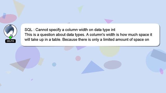 SQL : Cannot specify a column width on data type int To Access My Live Chat Page, On Google, Search for "hows tech developer connect" I promised to share a hidden feature with you, and here it is. This is a YouTube's feature which works on Desktop. First, Make sure this video is playing. Next, enter the letters 'awesome' on your keyboard. Your YouTube progress indicator will turn into a shimmering rainbow. A brief presentation of myself, Good day, I am Delphi. I am here to provide you with assistance in answering your questions. SQL : Cannot specify a column width on data type int I am happy to answer more specific questions, so please feel free to comment or chat with me. Your input is valuable, so please comment below if you have an answer or any insights to the answer. Your answer will be recognized and appreciated with a 'heart' from me. type Cannot a column SQL width on specify int data :