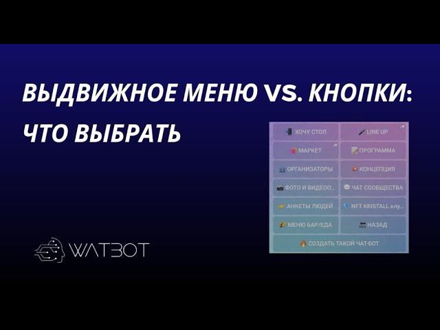 Всем привет! На связи команда Watbot - платформы-конструктора чат-ботов, которые вы можете собрать самостоятельно, не имея никаких навыков программирования! Когда мы показываем наши кейсы, то можно увидеть использование разных типов меню: - стандартное, с кнопками (пользователь кликает на кнопку, ему приходит следующее сообщение и т.д.) - всплывающее (когда при клике на кнопку всплывает список и при клике на один из объектов приходит сообщение с более подробным описанием). Очень часто второй вариант кажется более интересным для реализации, однако он подходит не для всех задач. В этом видео мы на примере показали разницу между двумя типами. Регистрируйтесь на платформе по ссылке ниже и собирайте чат-бот с нуля за пару часов с помощью наших инструкций! Подробности можешь узнать на нашем сайте https://watbot.ru/?utm_source=youtube Будем рады видеть вас в нашем сообществе, присоединяйтесь по ссылке https://t.me/watbotcommunity #чатбот #чатботы #бот #телеграмбот #боты