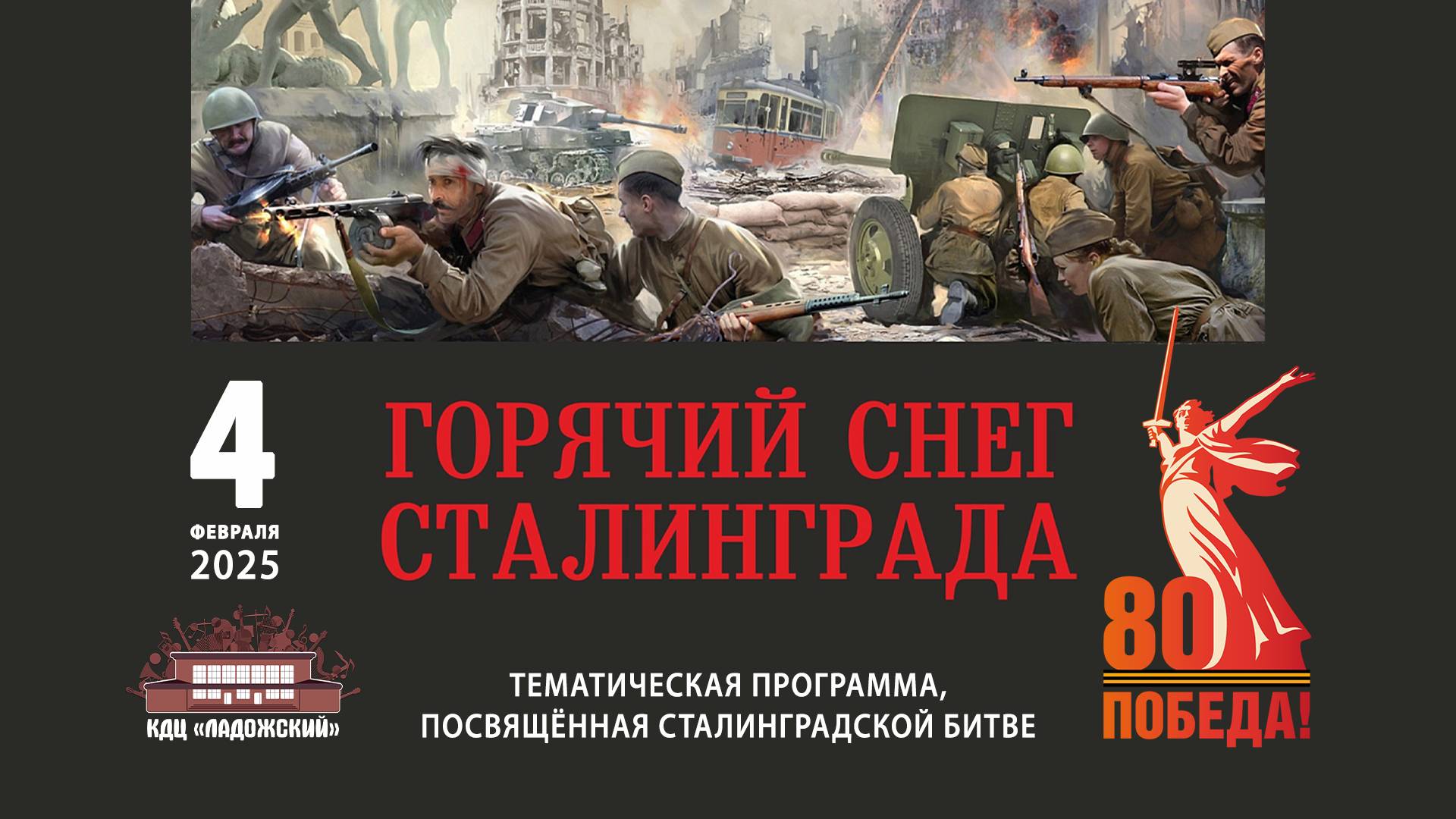 «Горячий снег Сталинграда» 4 февраля 2025 года в зрительном зале Культурно-досугового центра «Ладожский» в рамках конкурса имени маршала Жукова прошла тематическая программа «Горячий снег Сталинграда». В ходе мероприятия демонстрировались кадры документальной хроники тех событий, говорили о подвигах защитников города: Я.Ф. Павлове - командире группы бойцов, защищавших 59 дней дом в центре города, о том, что Сталинградская битва – одна из крупнейших в Великой Отечественной войне 1941-1945 годов. Двести дней и ночей на берегах Дона и Волги, а затем у стен Сталинграда и непосредственно в самом городе продолжалась эта ожесточенная битва. Также прозвучали современные песни о войне. С момента Сталинградской Битвы прошло 82 года, но память о ней жива, пока живы люди, которые помнят, какой великий подвиг был совершен нашими предками!