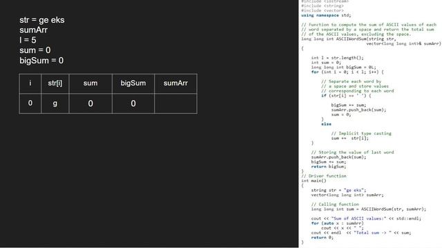 Find Complete Code at GeeksforGeeks Article: https://www.geeksforgeeks.org/sums-of-ascii-values-of-each-word-in-a-sentence/ This video is contributed by Anant Patni. Please Like, Comment and Share the Video among your friends. Install our Android App: https://play.google.com/store/apps/details?id=free.programming.programming&hl=en If you wish, translate into local language and help us reach millions of other geeks: http://www.youtube.com/timedtext_cs_panel?c=UC0RhatS1pyxInC00YKjjBqQ&tab=2 Follow us on Facebook: https://www.facebook.com/GfGVideos/ And Twitter: https://twitter.com/gfgvideos Also, Subscribe if you haven't already! :)