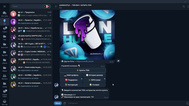 Купить TON - https://t.me/lh_tonbuy_bot ✅ Полезные сервисы: ТГ-канал - https://t.me/lh_crypto1 Купить TG-звезды - https://t.me/lh_crypto1/4732 Продать TG-звезды - https://t.me/lh_crypto1/7430 Реферальный бот - https://t.me/lhrefs Наши чаты - https://t.me/leanchatik В новом видео продолжаю тему "масс-адопшена" и упрощаю с нашей командой процесс покупки TON до примитивной "оплаты - получении монет". Ссылка на бота находится первой в описании. Автор канала — https://t.me/lhmanag Зарабатывай на схемах - https://clck.ru/3EYXhF #leanhustle #ton #telegram