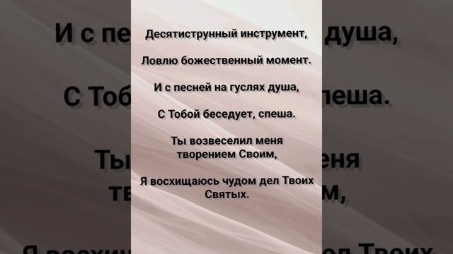 ХРИСТИАНСКИЕ ПЕСНИ ДЛЯ ХВАЛЫ ПОКЛОНЕНИЯ ПРОСЛАВЛЕНИЯ ЕВАНГЕЛИЗАЦИИ ДУХОВНОГО РОСТА ПРОБУЖДЕНИЯ ВОЗРОЖДЕНИЯ #господь#музыка#христианская_музыка#музика#христианскиепесни#бог#христианскиестихи#любовь#христианство#стихи#песня#песни#иисус#иисусхристос#иисусмойбог#иисус_христос#иисусбог#иисусгосподь#хвалы_и_поклонения#хваление#хвала#прославление#духсвятой#духовныйрост#духовноепробуждение#духовность#евангелие#евангелизация#евангельскаявесть#духовный_рост#пробуждение#рождество#рождествохристово#божий#божийнарод#божьеслово  #ХристианскаяПесня #ХристианскоеПоклонение #ХристианскаяНоваяПесня #ПастырьМоейДушы #ХристианскаяМузыка #ПесняСлавы #Иисус #ЛюбовьБожья #ХристианскиеТексты #СлаваГосподу #ВераИПоклонение #ВечнаяЛюбовь #RussianChristianSong #RussianChristianWorship #RussianChristianMusic #RussianWorship #NewRussianChristianMusic  #RussianChristianMusic #RussianSongOfPraise #Jesus #GodsLove #ChristianLyrics #GloryToGod #RussianFaithAndWorship #EternalLove #Пасха #Воскресение #ХристосВоскрес #пробуждение #возрождение https://stihi.ru/avtor/zhanna70 "ТЫ - СЛАВА МОЯ!" СЛОВА, МУЗЫКА, ОБРАБОТКА:  ЖАННА ВОЛКОВА-ВАРЛАМОВА https://stihi.ru/2025/06/24/831 Стихи Жанна Юрьевна Волкова-Варламова Вступление 1 Куплет Какое блаженство славить Тебя в тиши, Петь хвалу Тебе от всей своей души. Возвещать с зарёй о милости Твоей...  И, об истине до конца своих дней.  Припев: Велики, Господи, дела Твои, И мысли дивно глубоки. Меня возносишь Ты, как рог, И свежий льёшь елей у ног. Ты -  Слава моя...Ты - Сила моя, С Тобой не страшусь я огня. 2 Куплет Десятиструнный инструмент, Ловлю божественный момент. И с песней на гуслях душа, С Тобой беседует, спеша. Ты возвеселил меня творением Своим, Я восхищаюсь чудом дел Твоих Святых. Припев: Велики, Господи, дела Твои, И мысли дивно глубоки. Меня возносишь Ты, как рог, И свежий льёшь елей у ног. Ты - Слава моя...Ты - Сила моя, С Тобой не страшусь я огня. Десятиструнный инструмент, Ловлю божественный момент. И с песней на гуслях душа, С Тобой беседует, спеша. Ты возвеселил меня творением Своим, Я восхищаюсь чудом дел Твоих Святых. Припев: Велики, Господи, дела Твои, И мысли дивно глубоки. Меня возносишь Ты, как рог, И свежий льёшь елей у ног. Ты - Слава моя...Ты - Сила моя, С Тобой не страшусь я огня. 3 Куплет Нечестивые, как сорняки, Их дни и помыслы легки. Но процветая, пропадут, И свой конец они найдут. А Ты, Всевышний, со мной навсегда, Моя Ты надежда и моя Ты звезда!  Бридж Праведник, как пальма, зацветёт, Как кедр ливанский, ввысь пойдёт. Я в доме Твоём насажденный...  По милости Твоей спасённый!  Припев: Велики, Господи, дела Твои, И мысли дивно глубоки. Меня возносишь Ты, как рог, И свежий льёшь елей у ног. Ты -  Слава моя...Ты -  Сила моя, С Тобой не страшусь я огня. Заключение: И в старости мы будем плодовиты, Твоей любовью мы, Иисус, покрыты. Чтобы возвещать, что праведен Господь, Он наша твердыня... От его плоти наша плоть. 22.06.2025 Жанна Волкова-Варламова