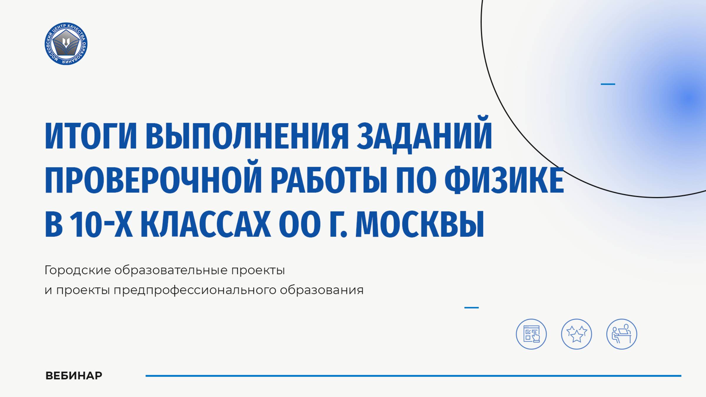 Приглашаем принять участие в вебинаре, посвященном подведению итогов проверочной работы по физике в 10-х классах (углубленный уровень). Эксперт Московского центра качества образования Ирина Васильевна Васильева расскажет слушателям о результатах выполнения заданий проверочной работы по физике в 10-х классах (углубленный уровень), выявленных трудностях у учащихся, даст методические рекомендации по их устранению. Видео будет интересно заместителям директоров образовательных учреждений по управлению качеством образования, учителям физики, работающим в 10-х классах общеобразовательных школ Москвы, участвующих в реализации городских образовательных проектов и проектов предпрофессионального образования, а также всем желающим.