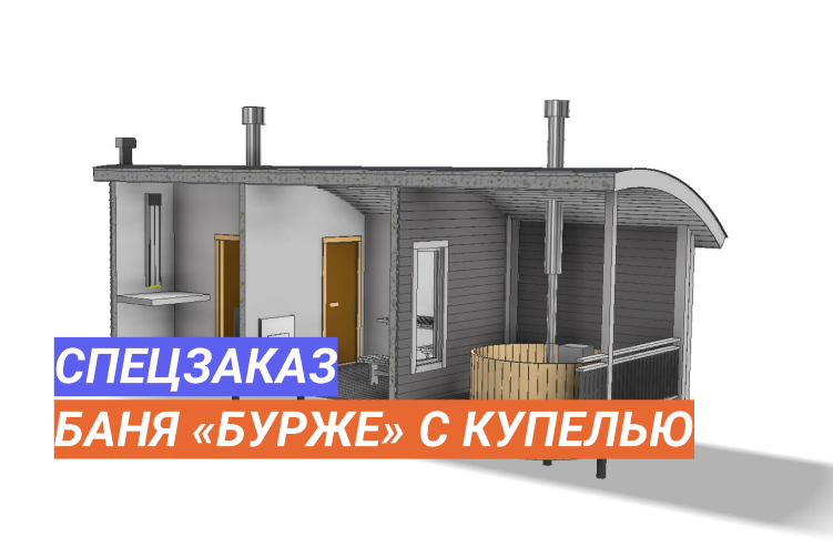 Большие серьёзные заказы требуют кропотливой предварительной подготовки. Для таких Клиентов отрисовываю визуализацию — а заодно записываю видеообзор. Этот проект нужно рассматривать как пример наших возможностей. Итак, в основе лежит базовый проект «Бурже». Он дополнен просторной террасой, в которую будет встроена купель из термомодифицированной древесины — тоже нашего производства. Размер бани 4 на 8 метров. Баня строится по каркасной технологии с утеплением и отделкой доской внахлёст. Крыша — округлая фирменная. Внутри 4 помещения: парная, комната отдыха, душ и бойлерная. Комплектация каждого объекта оговаривается индивидуально с каждым клиентом.