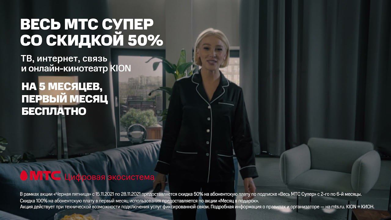 Подключи Весь МТС Супер с 15 по 28 ноября и получи скидку 50% на 5 месяцев! Домашний интернет и ТВ, онлайн-кинотеатр KION и мобильная связь в одной подписке.