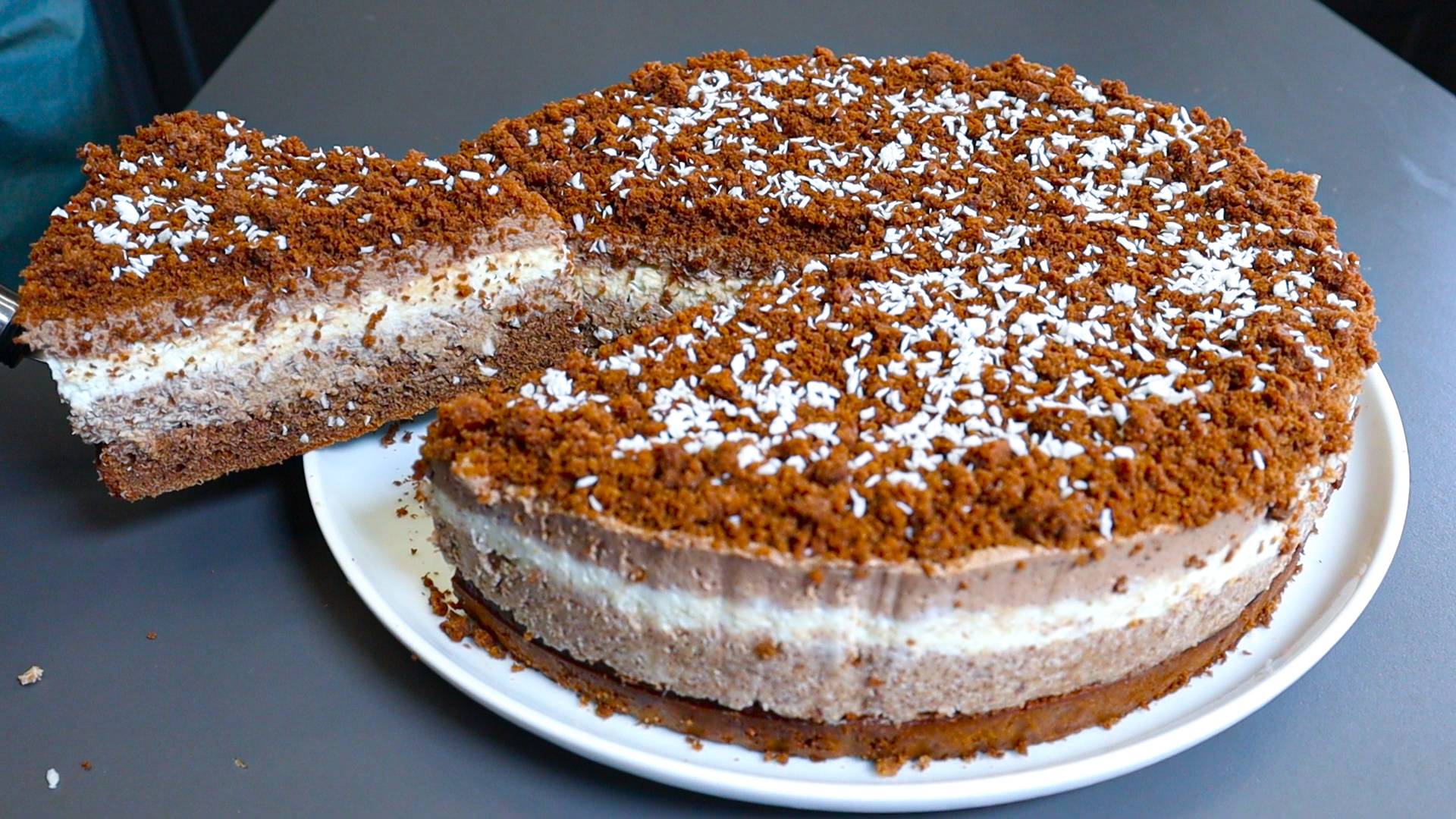 Добрый день! Сегодня приготовим обалденно вкусный торт. Рецепт вкусного десерта к чаю. - мука 220 г. + какао 40 г. - разрыхлитель 8 г. - яйца 4 шт. - щепотка соли + ванильный сахар 16 г. - сахар 180 г. - молоко 160 г. - растительное масло 40 г. - форма для выпечки 24 см. - в духовку на 35 минут при 180 °C. - сливки 300% 400 мл. - сыр маскарпоне 500 г. + сливочный сыр 300 г. - сахарная пудра 100 г. + ванильный сахар 16 г. - делим крем на 3 части. - добавляем 1/3 часть крема. - кокосовая стружка 50 г + крем 1/3 часть. - 75 г темного шоколада (растопленного). - кокосовая стружка. - в холодильник на 3-4 часа. Наш торт готов! Если понравилось поставьте лайк, подпишитесь и напишите комментарий!