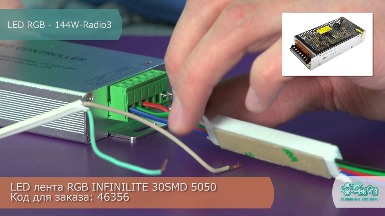 Контроллеры светодинамических эффектов, 12 В - LED RGB - 144W-Radio http://zenonline.ru/cat/000011629, 11 режимов, с радио пультом ДУ. Контроллеры светодинамических эффектов - LED RGB - 144W-Radio, работая в паре с RGB лентами или RGB модулями, создает светодинамические эффекты, перелив цветов, или фксированный цвет различных оттенков. Используется для световых коробов, объемных букв или интерьерной подсветки. Подключение: Контроллер работает от сети 12 V (т. е. подключается через источник питания 12 V) Провод от блока питания 12 V заводится в клеммные зажимы контроллера "IN+" и "GND" Полярность - имеет значение. Светодиодный индикатор красного цвета сигнализирует о том, что контроллер включен в сеть и готов к работе. Светодиодный индикатор зеленого цвета сигнализирует переключение программ. В остальные клеммные зажимы R G B и OUT+ подключается лента или модули: R - Красный провод. G - Зеленый провод. B - Синий провод. OUT+ - (чаще всего) Черный провод. Описание клавиш пульта: Program - Переключение всех программ контроллера "Speed up" и " Speed down" - Увеличение или уменьшение скорости выполнения программы. "on/off" - включение, выключении программ. После включения контроллера выполняется последняя работающая программа перед выключением. Описание программ: - Семь фиксированных цветов (красный, синий, зеленый, фиолетовый, голубой, желтый, белый). - Резкая смена трех цветов (красного, зеленого и синего). - Резкая смена всех цветов и оттенков. - Плавное переливание всех цветов и оттенков. - Комбинированная программа.